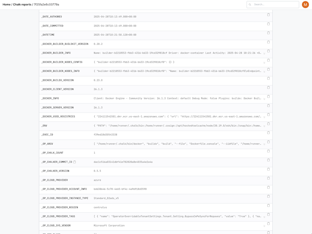 Then when the builds go through Chalk (now at https://chalkproject.io/), we capture an incredible amount of information. We know the container registries used, the container ID, processes run when the container is built… we have it all, hundreds of bits of meta-data from inside the build, not outside looking in. If you want to visibility, start by looking in the right place.
